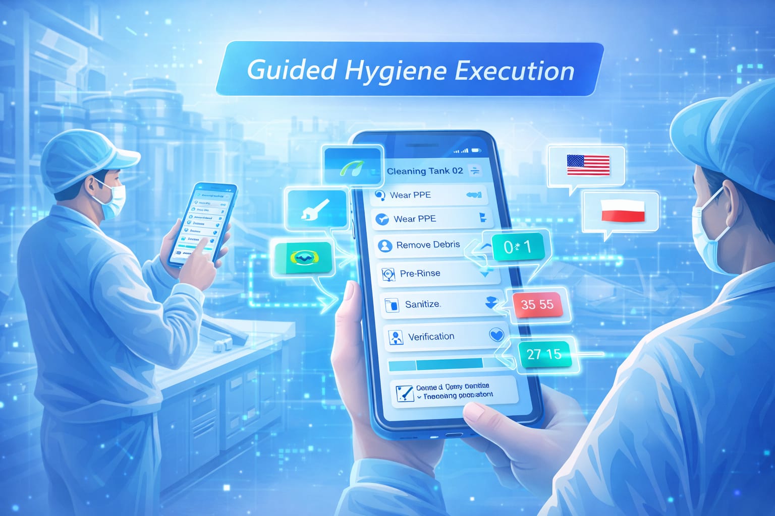 Operators receive step-by-step cleaning instructions directly on mobile devices in their native language. The system guides staff through correct procedures, reducing interpretation errors and ensuring consistent sanitation across shifts.