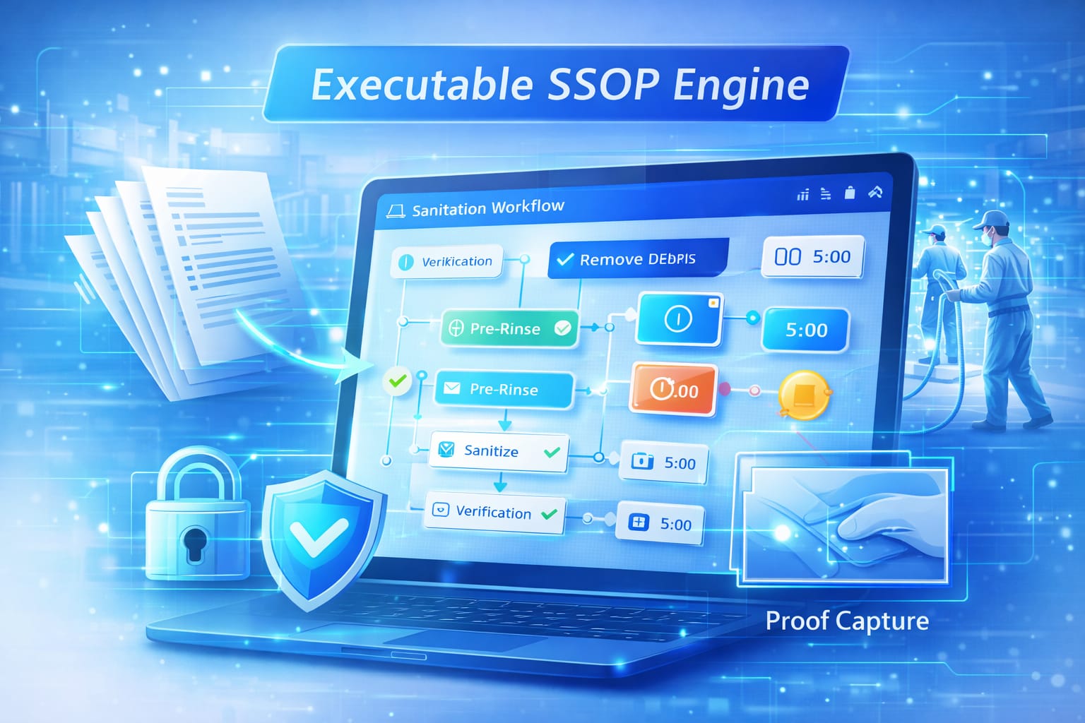 HygieneOps converts Sanitation Standard Operating Procedures into machine-enforceable workflow graphs with dependencies, timers, release gates and mandatory proof capture. This ensures every sanitation step is executed correctly before production can restart.