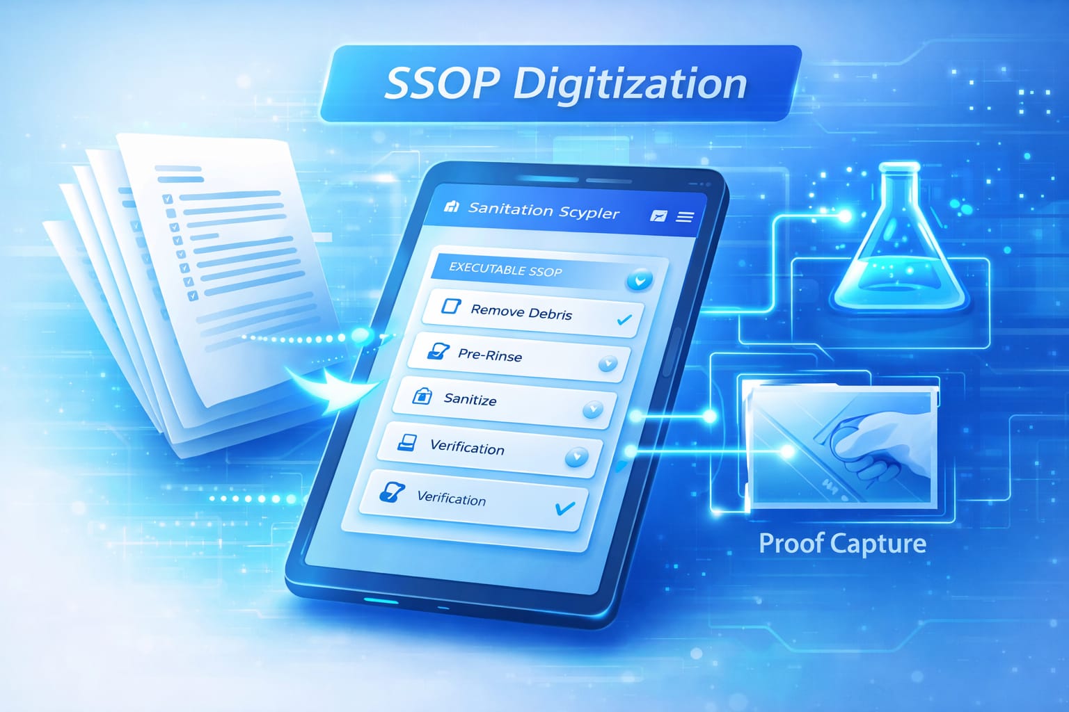 Existing sanitation procedures are converted from static documents into machine-enforceable digital workflows. Each cleaning task includes required steps, timers, chemical checks, and mandatory proof capture to ensure correct execution.