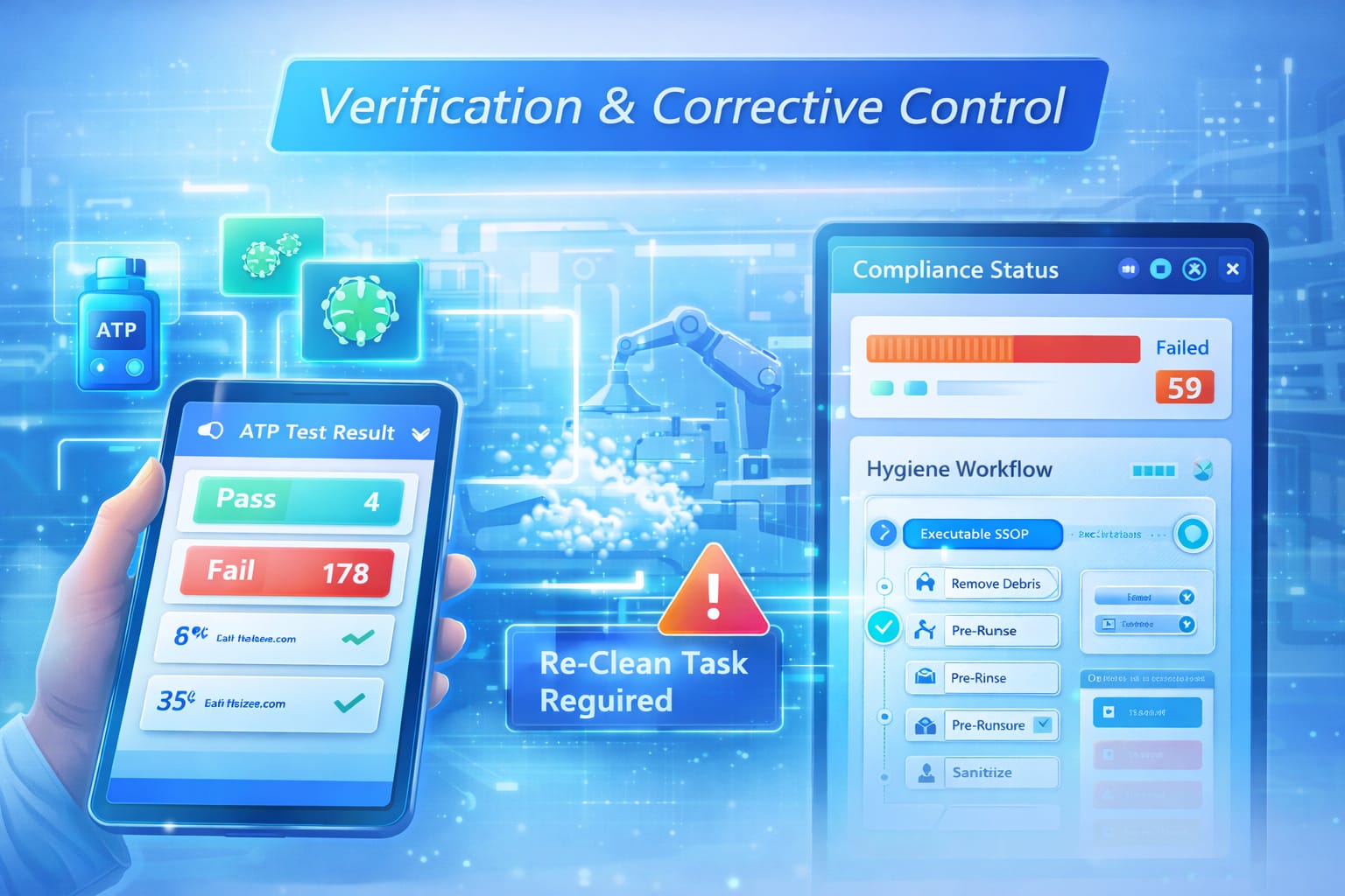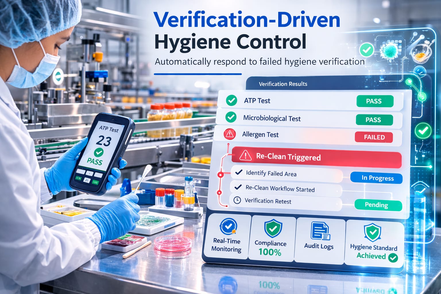 Verification tests such as ATP, allergen, and microbiological checks validate cleaning results. If a verification fails, the platform automatically triggers targeted re-clean workflows until a verified hygiene pass is achieved.