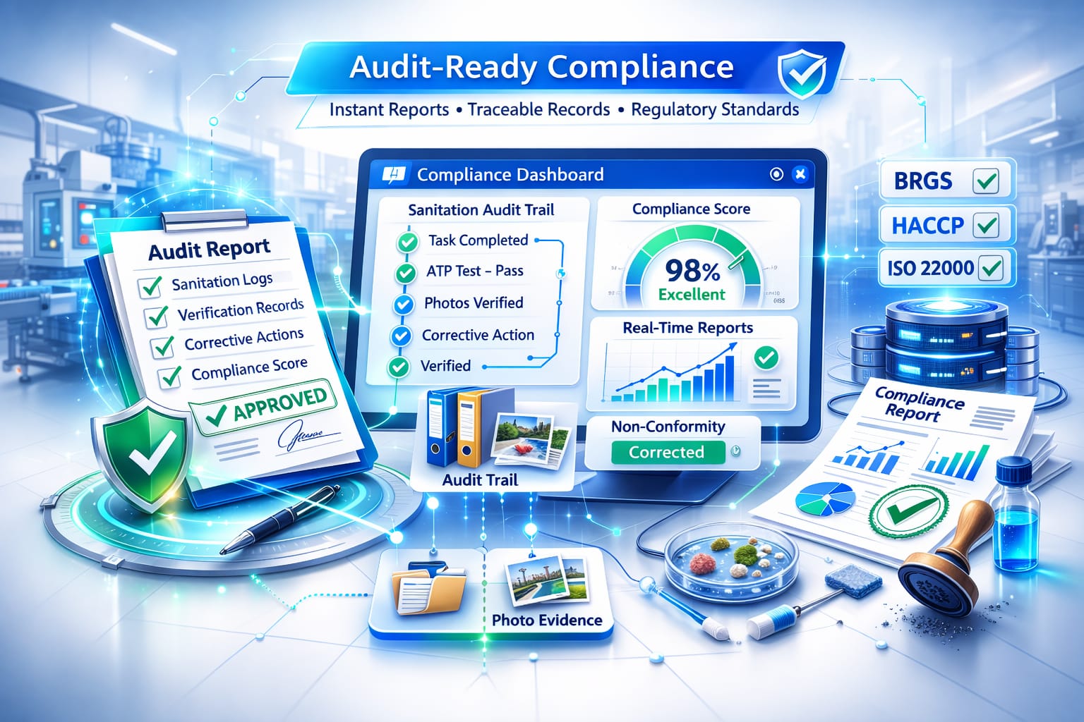 All sanitation actions, verification results, and corrective actions are recorded in a structured evidence chain. The system generates instant audit evidence packs aligned with BRCGS, HACCP, and food safety inspections.