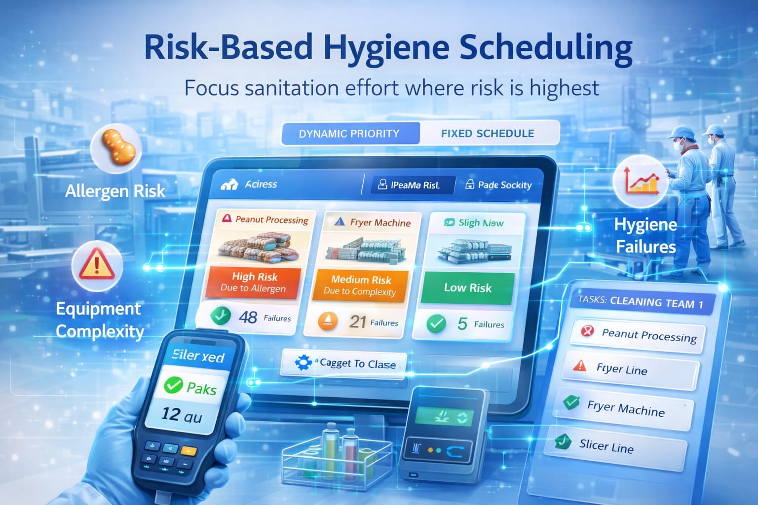 The platform allocates cleaning resources dynamically based on allergen risk, equipment complexity and historical hygiene failures. This ensures labour and cleaning resources are focused on high-risk assets instead of fixed time schedules.