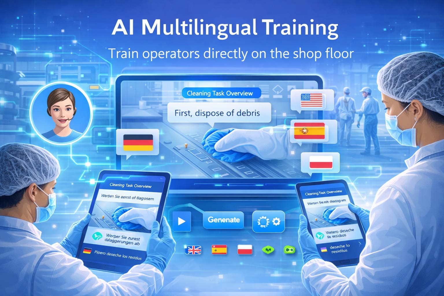 The AI training studio automatically generates short multilingual micro-videos explaining how to perform cleaning tasks correctly. This helps new staff and agency workers learn procedures instantly and reduces execution errors.